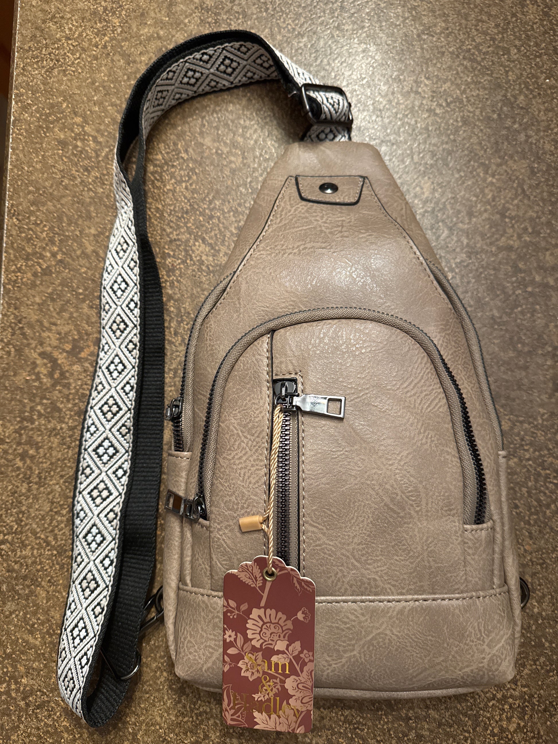 Deluxe, sling bag, vegan leather, guitar strap. Multiple zippered pockets. Strap can be moved from either side of the bag with adjustments. All bags are slightly different and unique